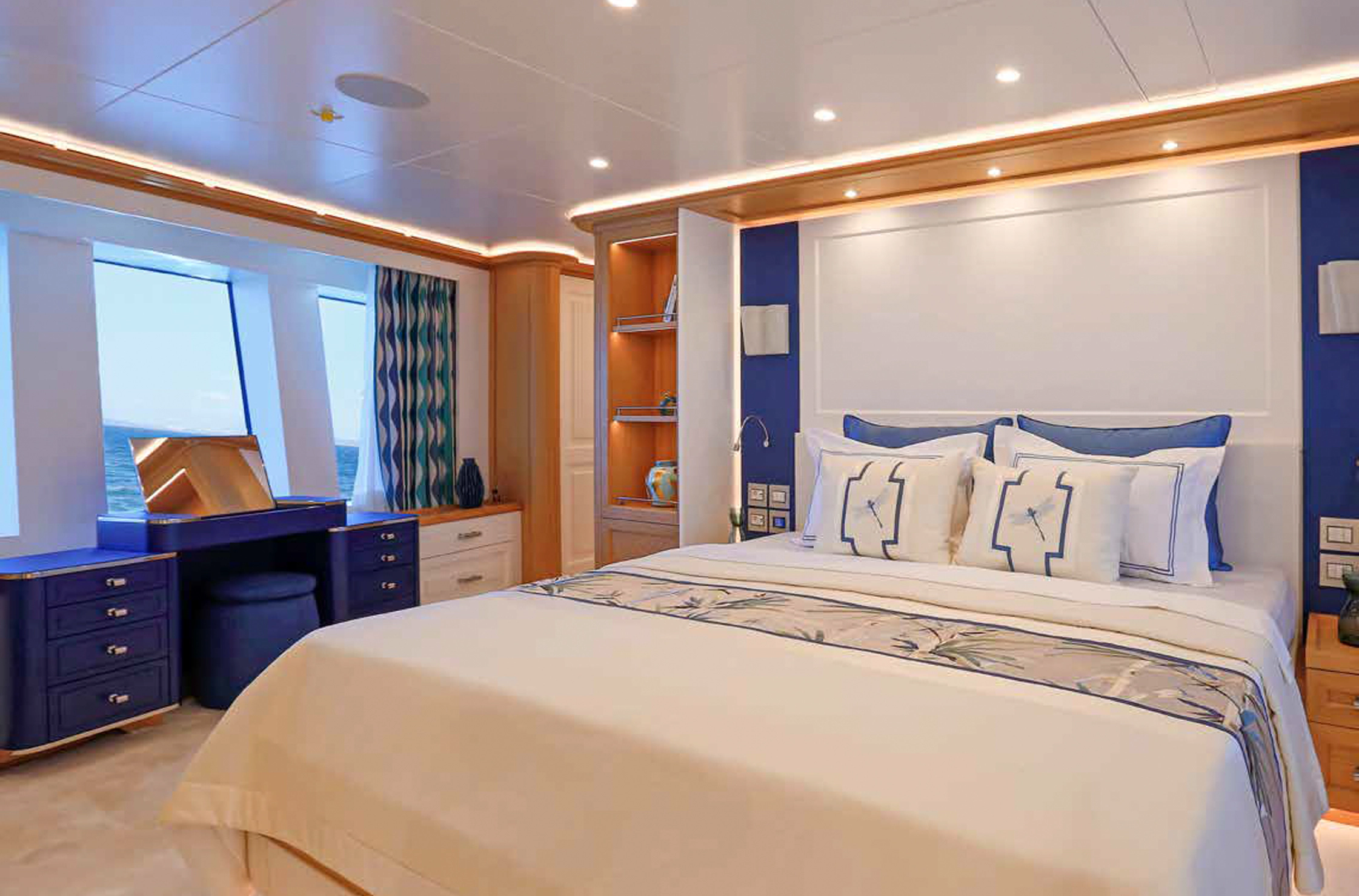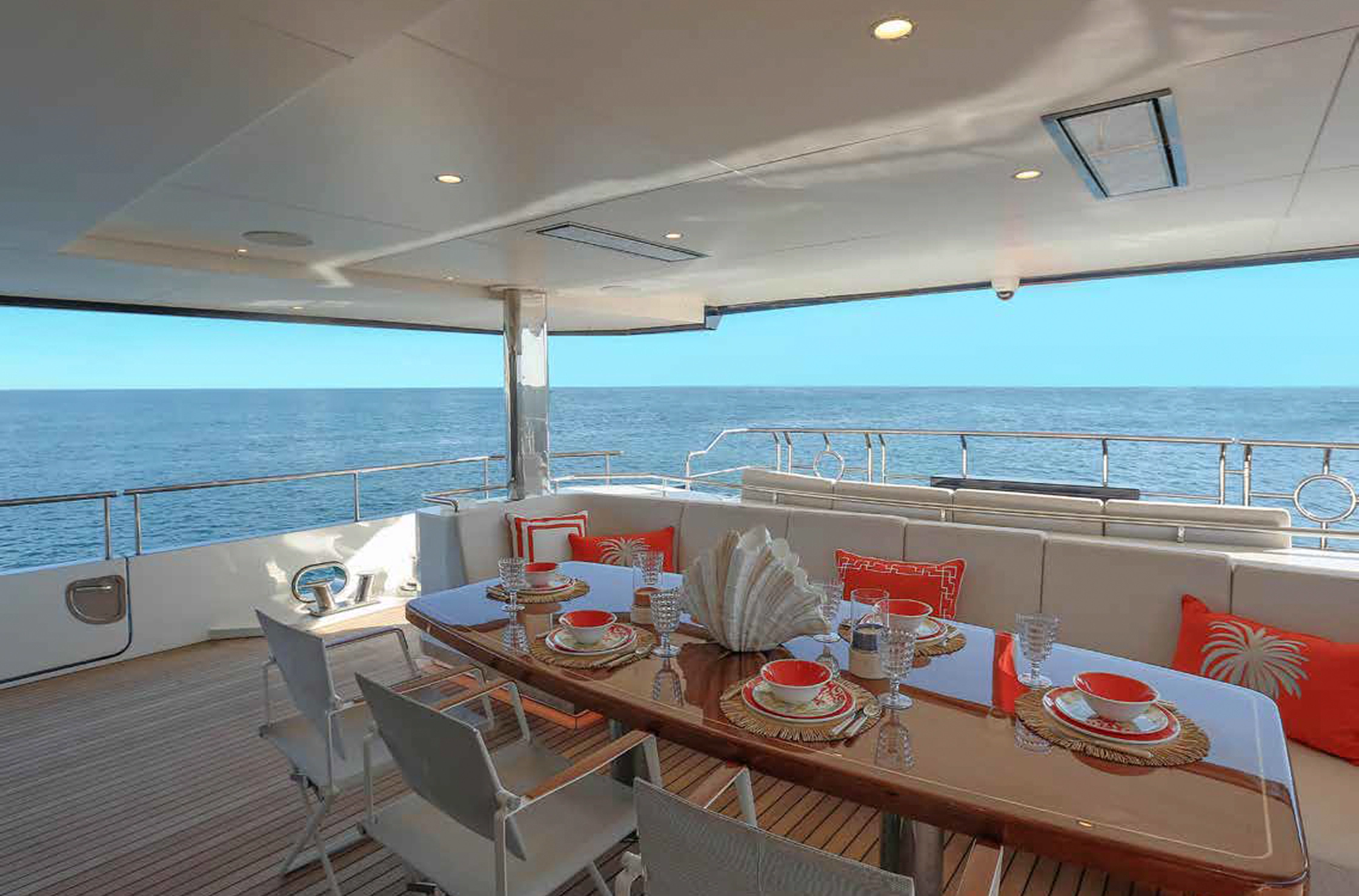The yacht accommodates 10 guests in five cabins, including a spacious main‑deck master suite. The interior, designed by Epikworks, pairs classic styling with practical functionality. Exterior highlights include a centerline infinity pool on the main deck aft and a well‑appointed sundeck featuring a full bar, jacuzzi, and sunpads. Crew accommodations consist of three lower‑deck cabins for up to seven crew, along with a captain’s cabin on the upper deck adjacent to the wheelhouse. Additional features include a commercial‑grade galley, Atlas shore‑power converters, and a dedicated lazarette for watersports, diving equipment, and spare parts.