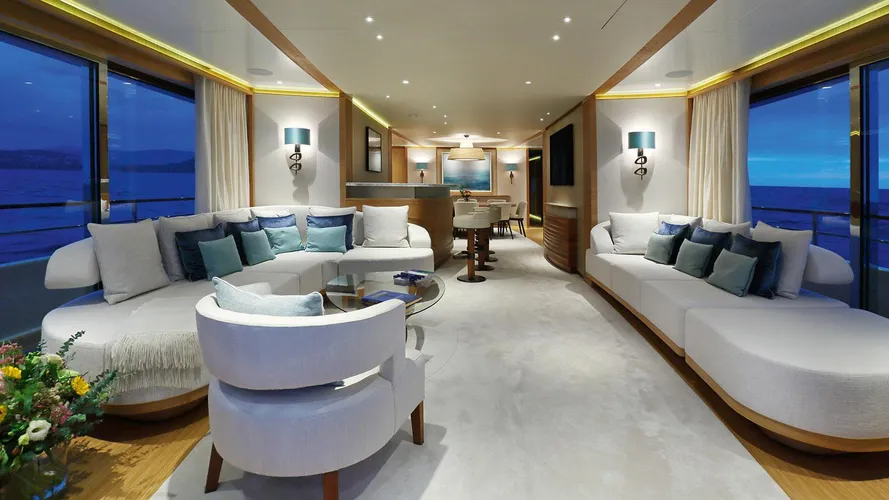 - Bright main salon with full‑height glass doors and fold‑down balcony