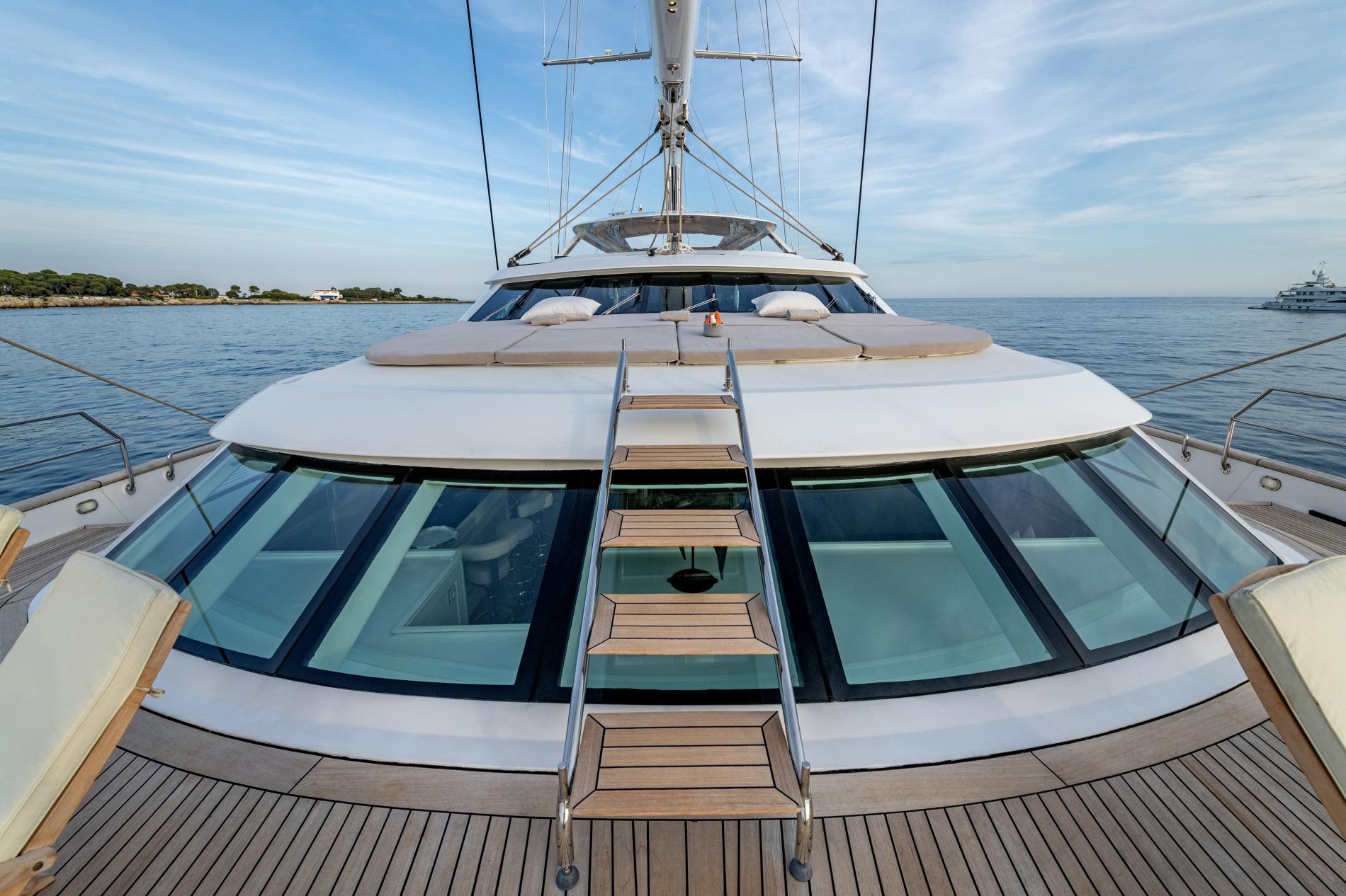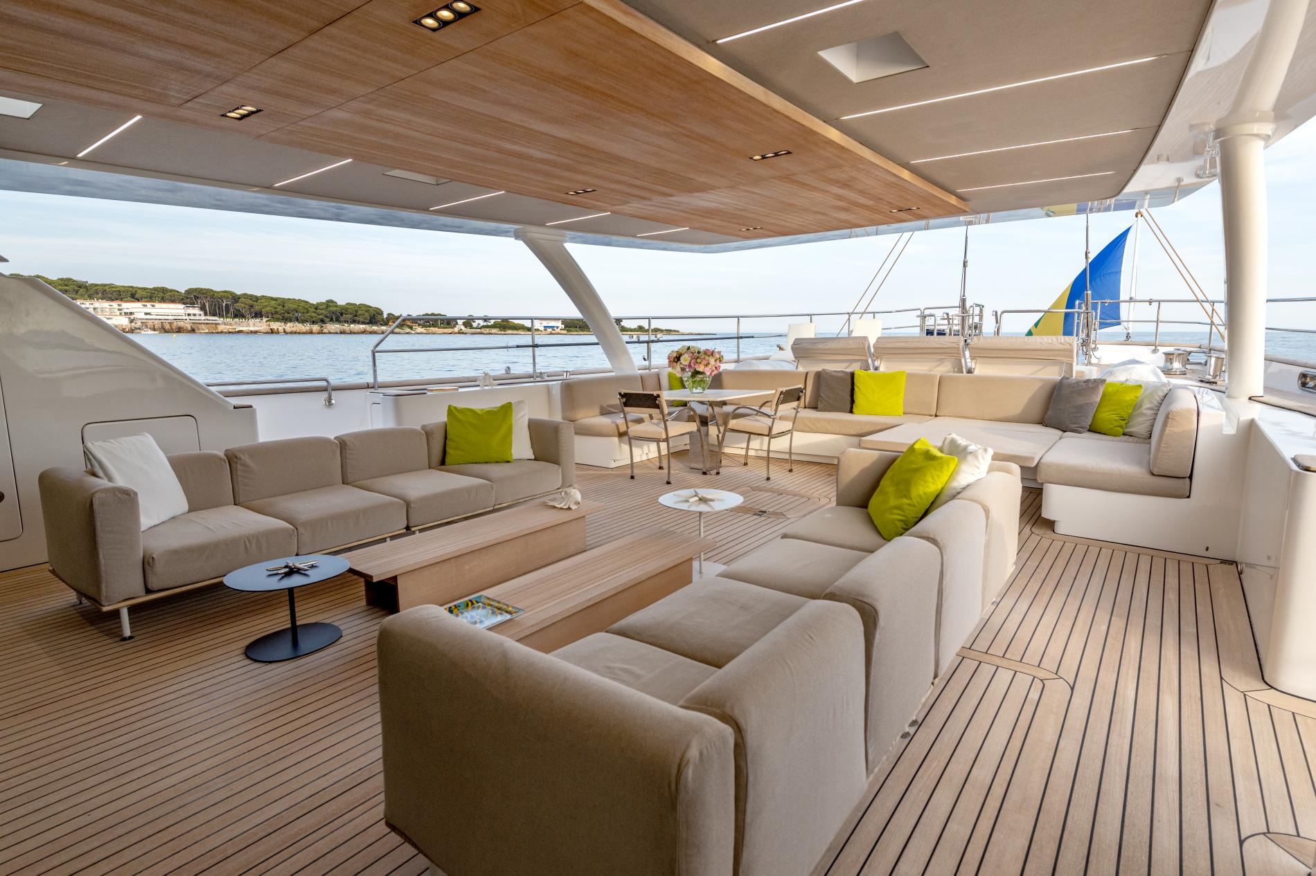 Her wheelhouse offers a comfy spot for thrilling views of the tall ketch rig in action. Savor cocktails at the upper deck bar, followed by a formal meal in the spacious dining area. On the main deck, dining and lounging areas are wind-protected and can be shaded. The flybridge is ideal for al fresco dining with stunning views, and a Jacuzzi completes the outdoor luxury.