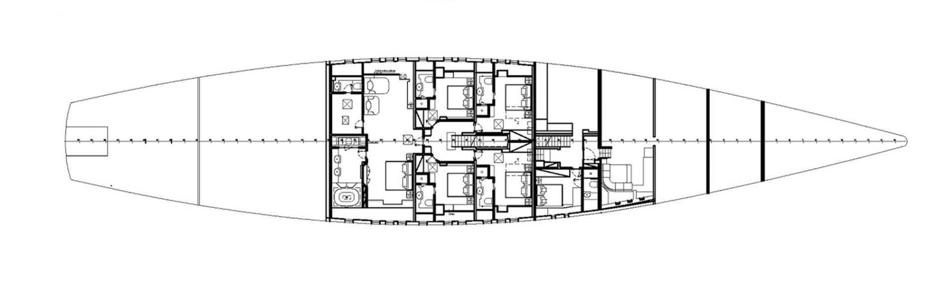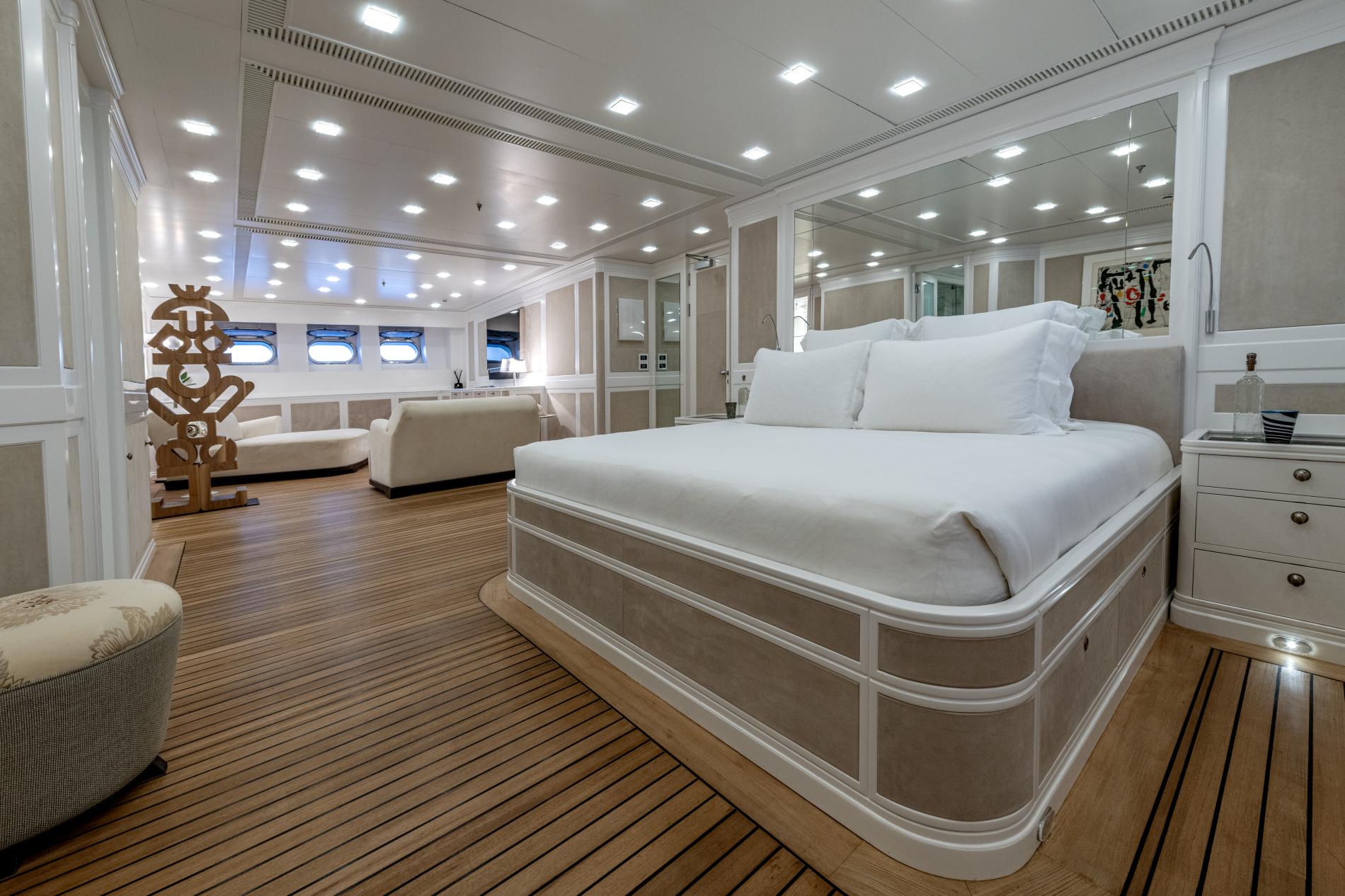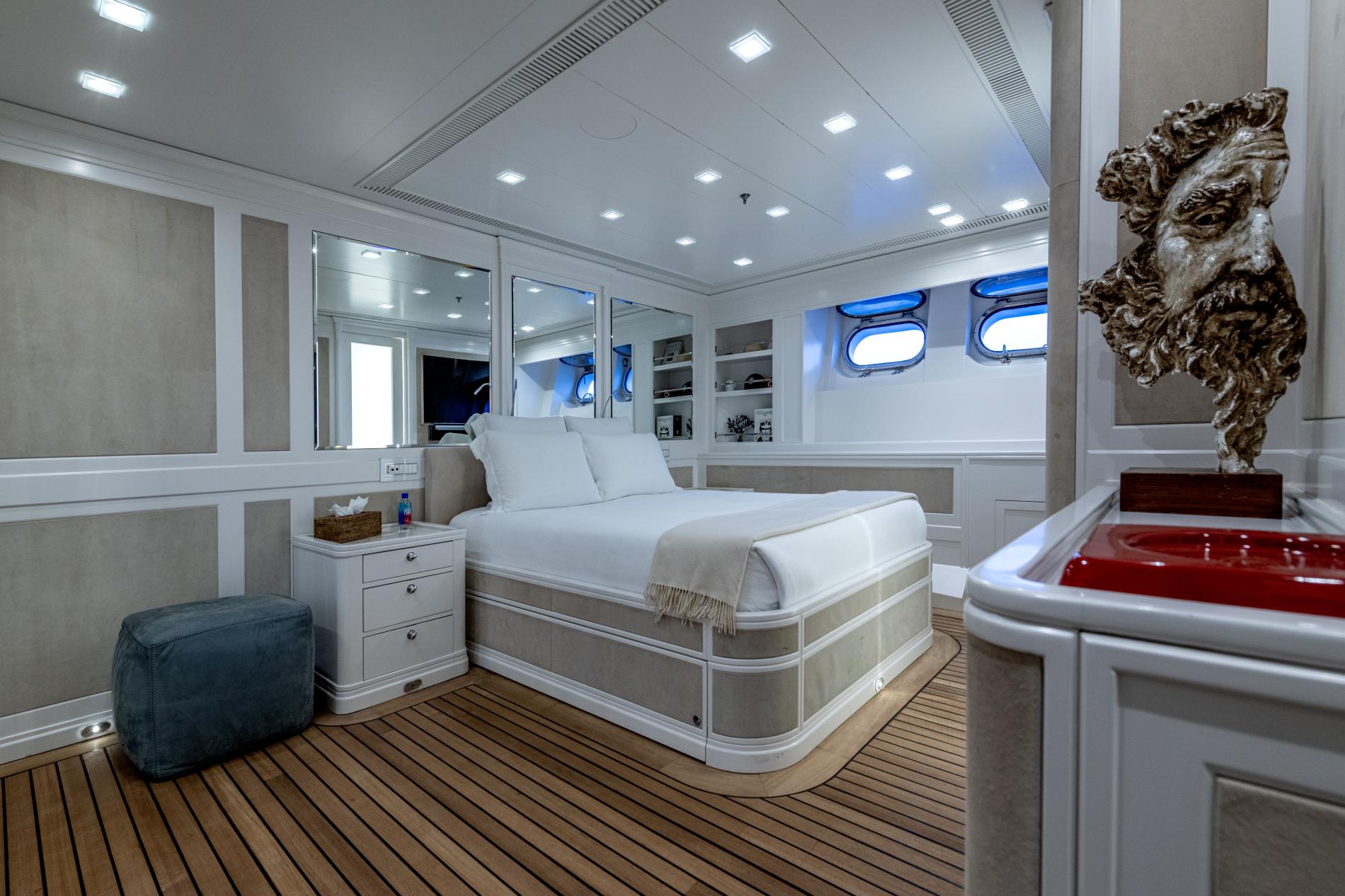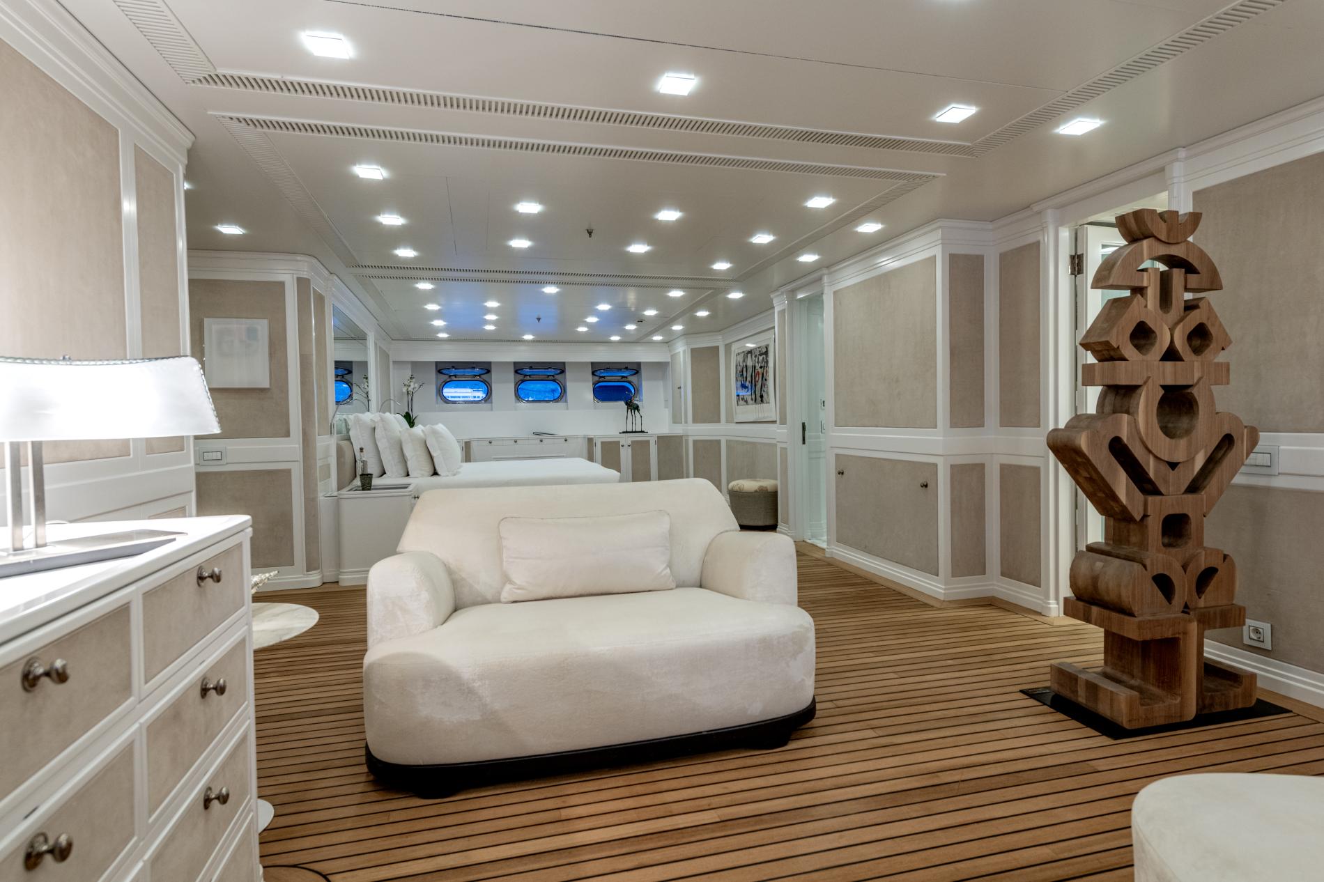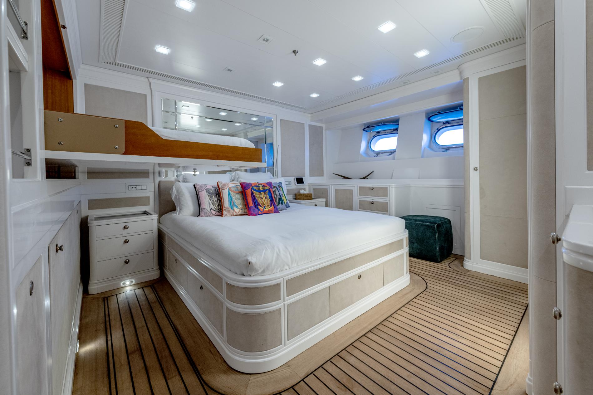 - Full-beam master suite and four double cabins with new teak floors