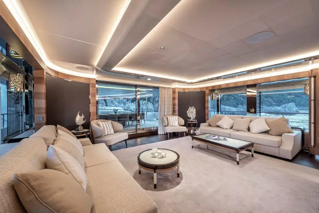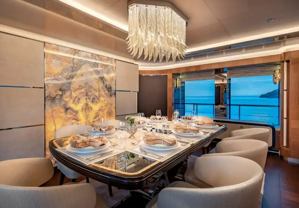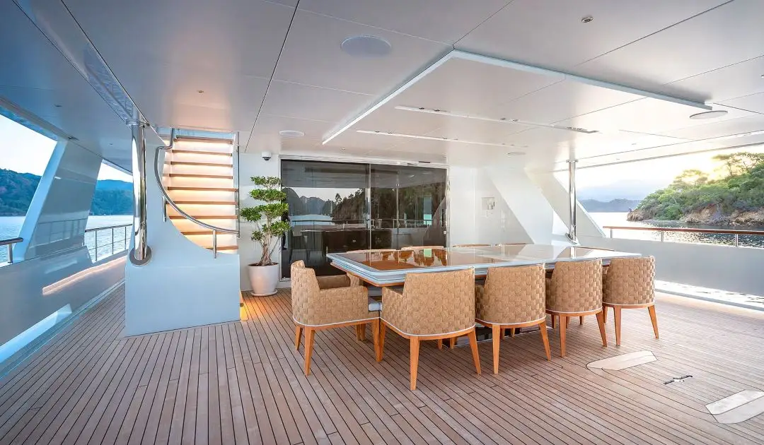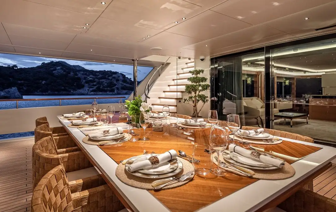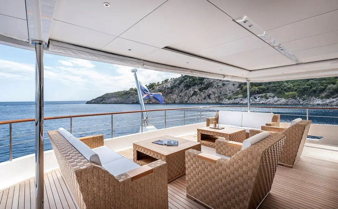 The expansive sky deck includes a bar, dining area, lounge seating, and sunbathing area, while the beach club and massive swim platform offer even more opportunities for relaxation and recreation.