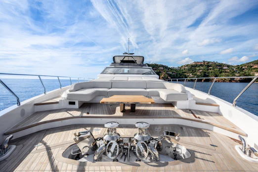 - Bow Lounge: Teak table, sunbathing area, full teak decking