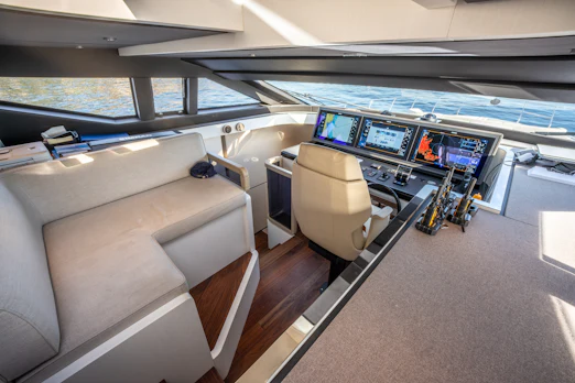 - Flybridge: Electric hardtop, U-shaped dining, full bar (fridges, icemaker, BBQ, teppanyaki), large sunpads, convertible forward lounge