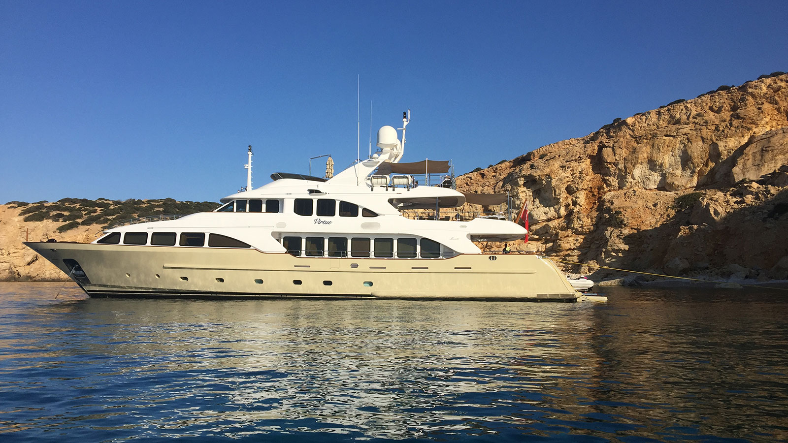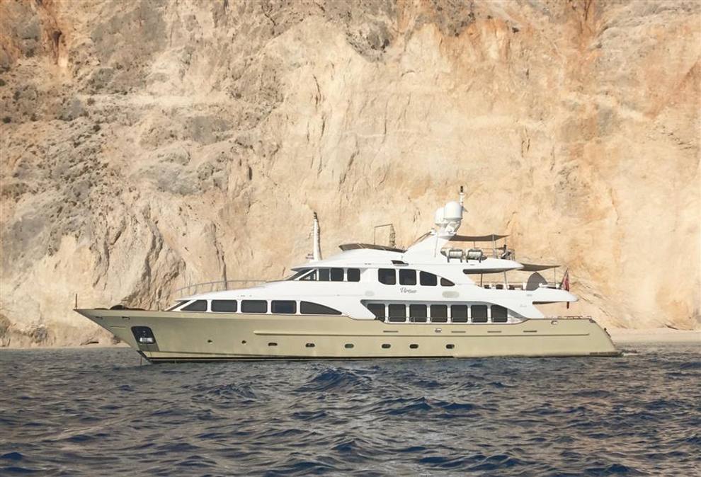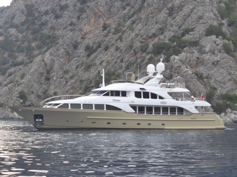 Inside, you’ll discover lavish lounges on the main deck alongside a formal dining area and a wet bar for relaxation or entertaining guests. Outdoors beckons with an aft deck perfect for open-air meals plus a sundeck packed full of amenities like gym equipment, shaded seating areas—and don’t forget about that jacuzzi! Propelled by twin MTU engines boasting 2,000 horsepower each; VIRTUE sails smoothly at speeds reaching up to 13.5 knots over an impressive range thanks in part due too its Naiad zero-speed stabilizers ensuring seamless travel even when stationary.