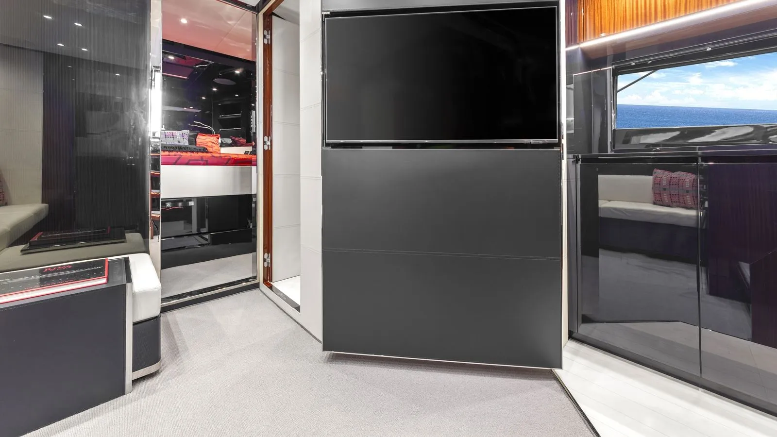 - Large aft sunpad with storage beneath; hydraulic teak swim platform with ladder and hot/cold shower