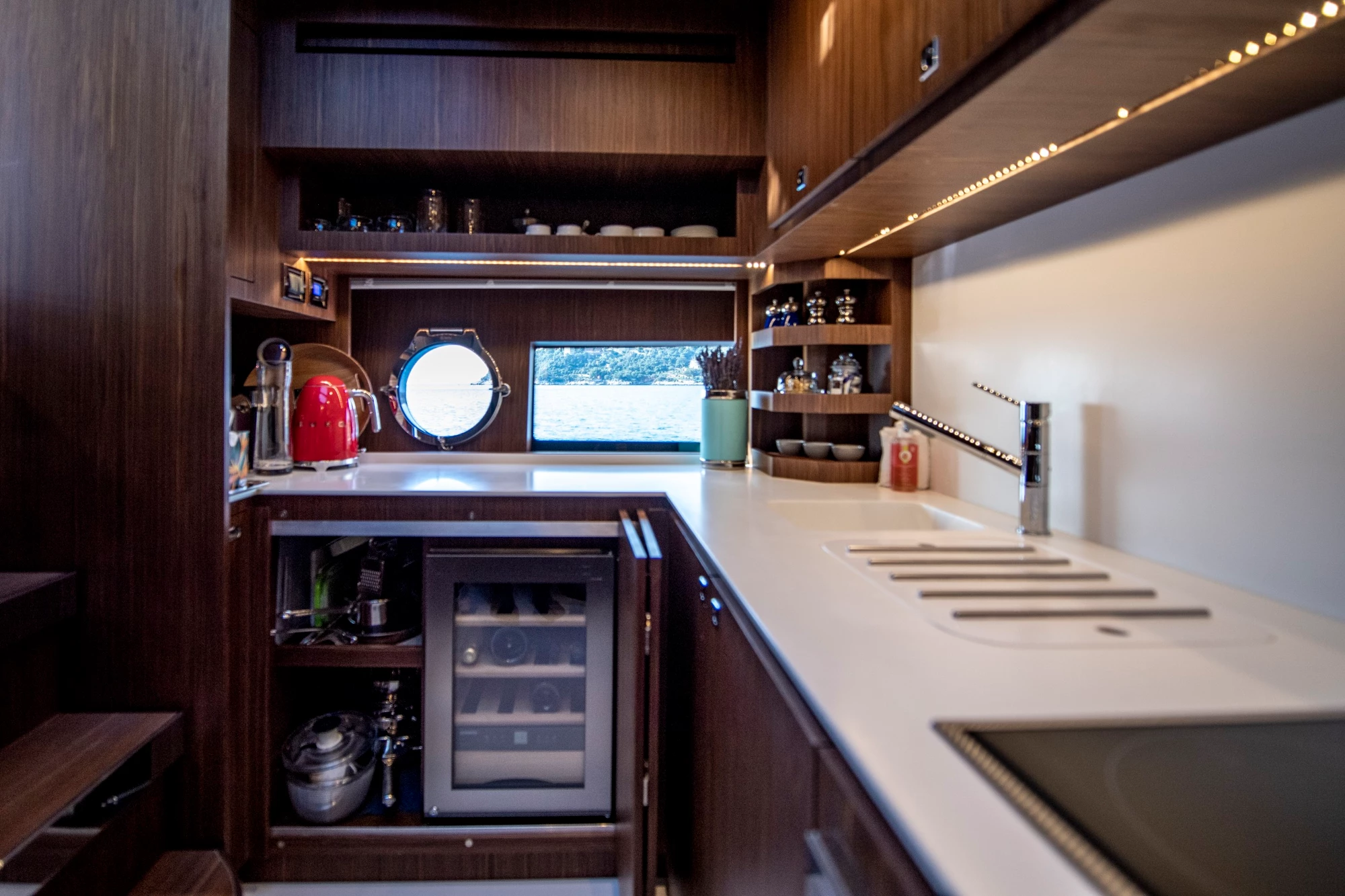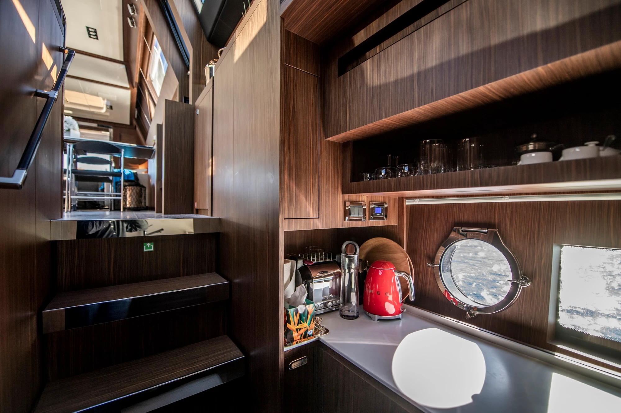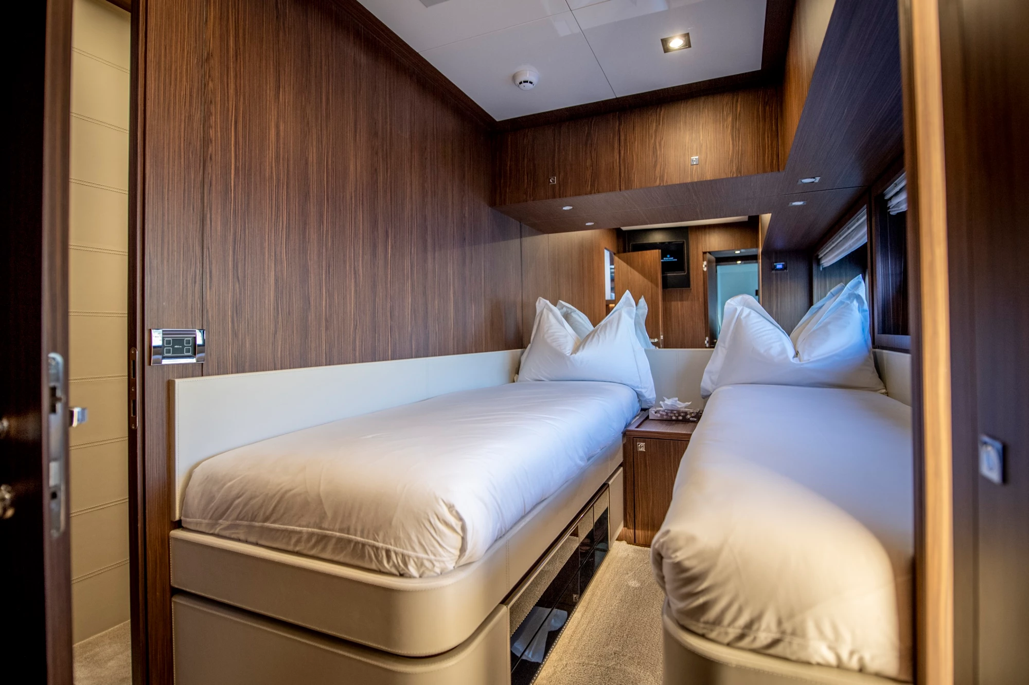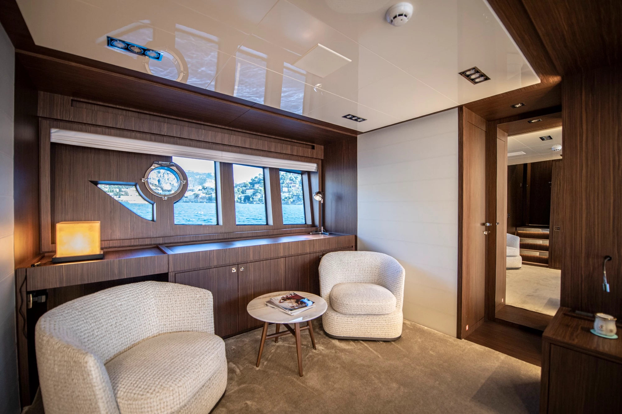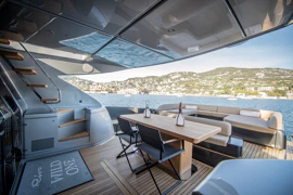 WILDONE’s metallic silver hull and sleek silhouette make her a standout on the water. With twin MTU engines, she boasts a heart-racing top speed of 40 knots and a smooth cruising range of 300 nautical miles at 25 knots.