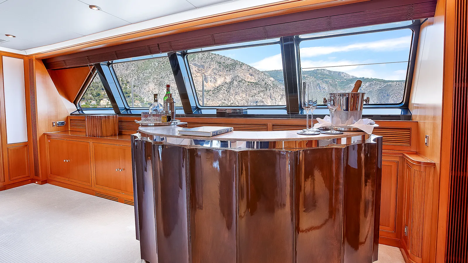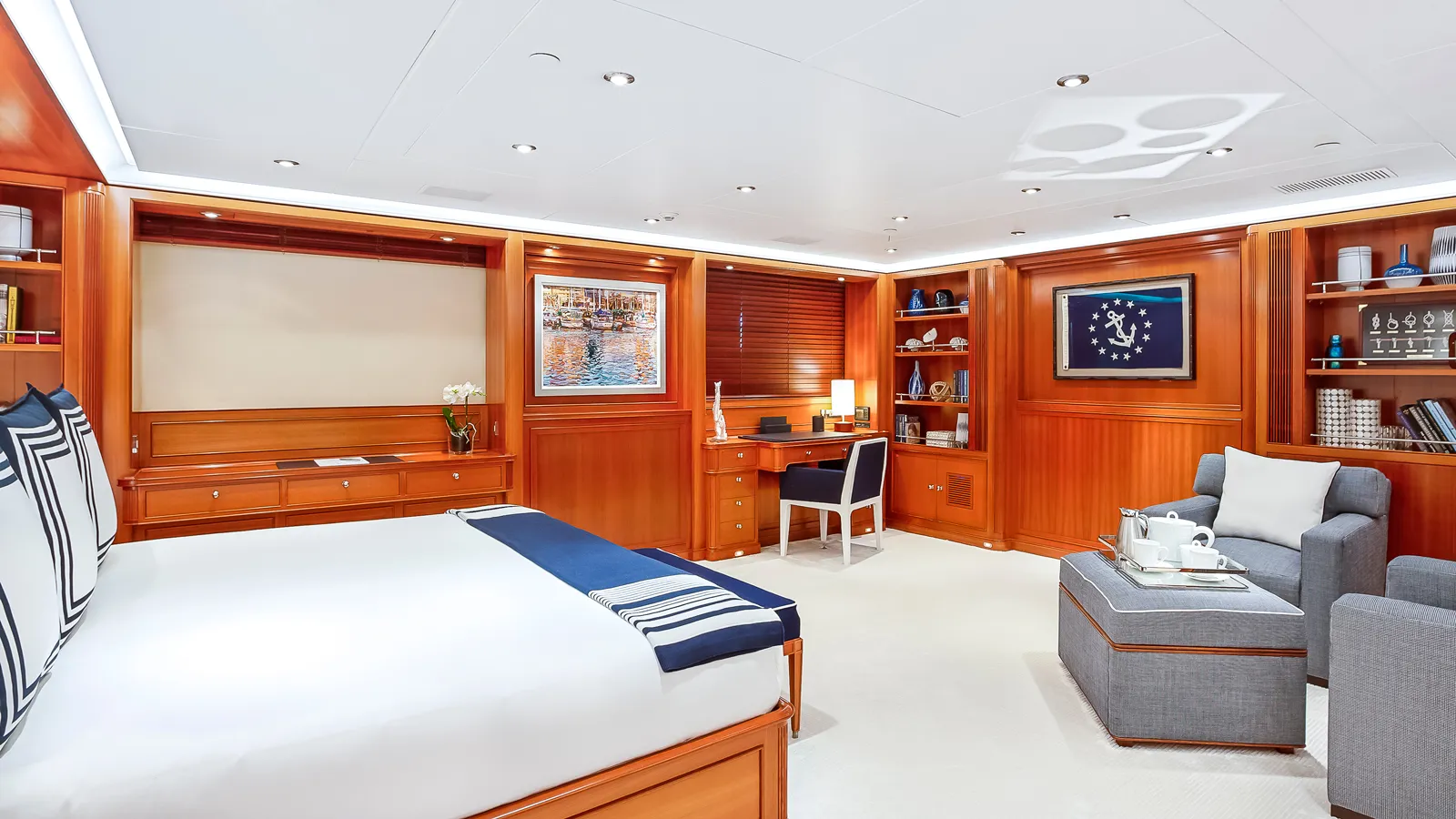 Zenji accommodates up to 14 guests across six sumptuous cabins. The master suite features a king-size bed, private seating area, expansive walk-in wardrobes, and a marble-en suite bathroom with his and hers sinks, tub, and shower. Two guest cabins offer king-size beds, while two twin cabins have Pullman berths for family flexibility. A sixth cabin with upper and lower berths completes the arrangement. Every cabin is en suite with exquisite marble finishes and thoughtful details.