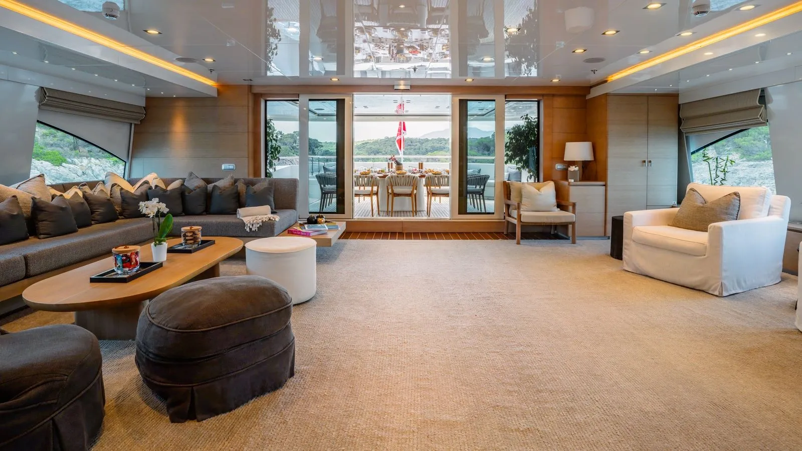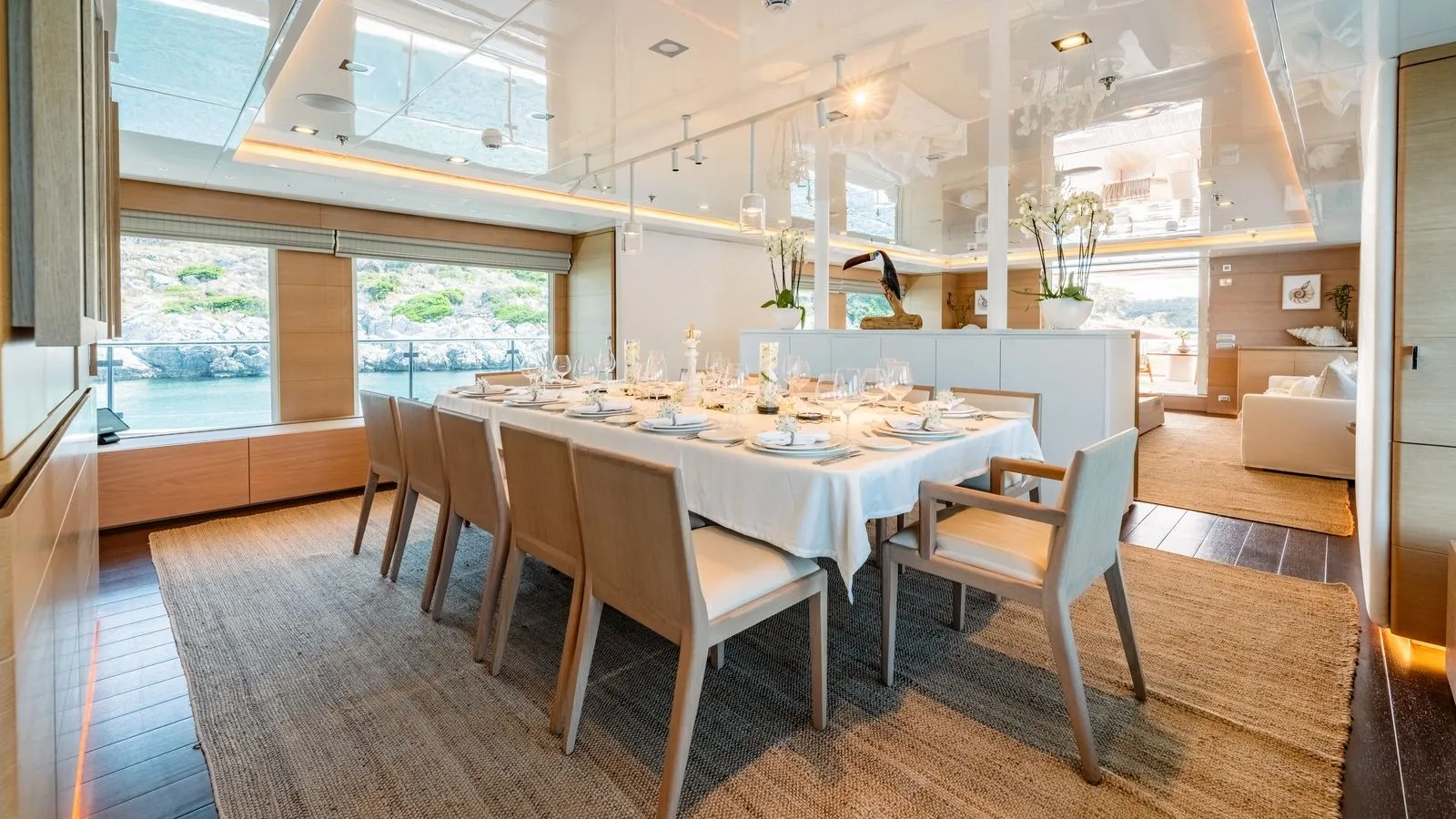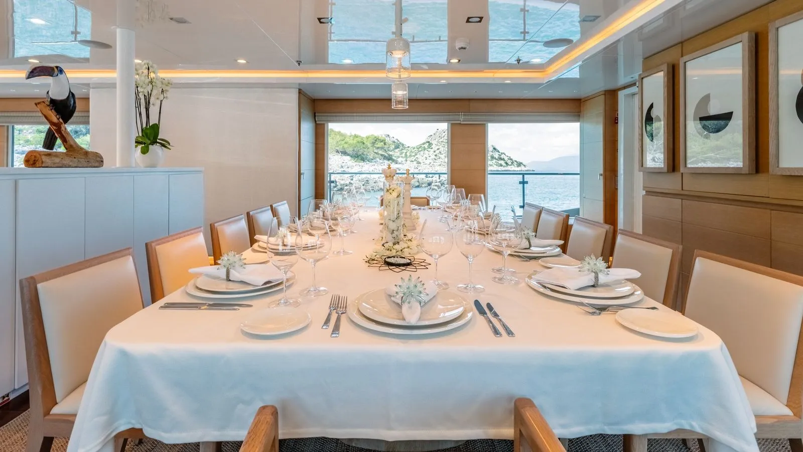 - Clean lines for a serene atmosphere\ Guests enjoy gourmet dining indoors or al fresco, prepared by the onboard chef.