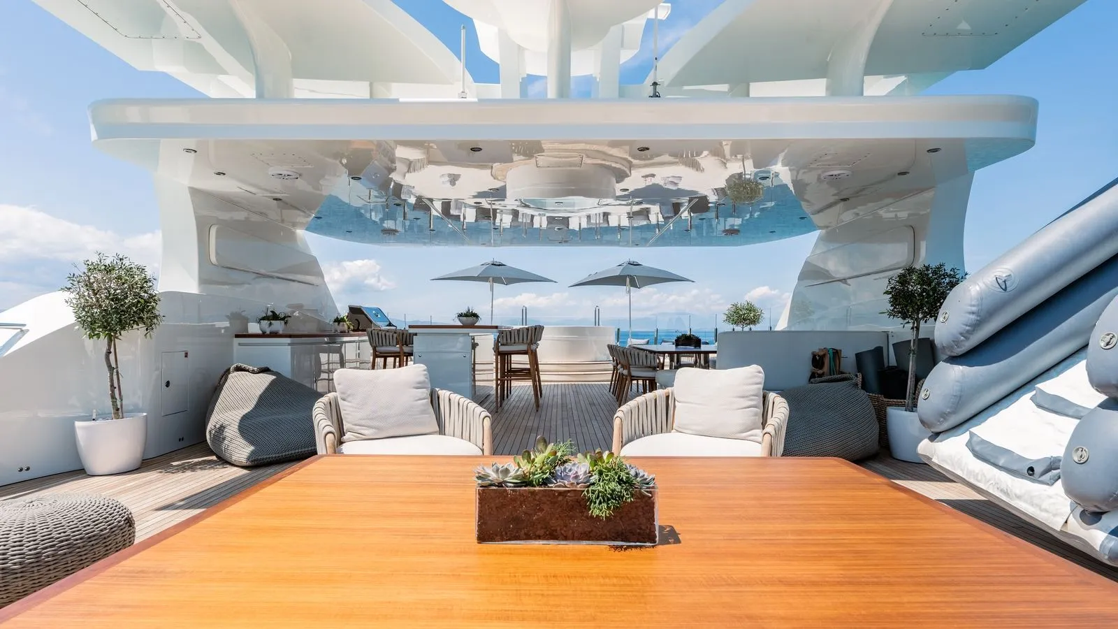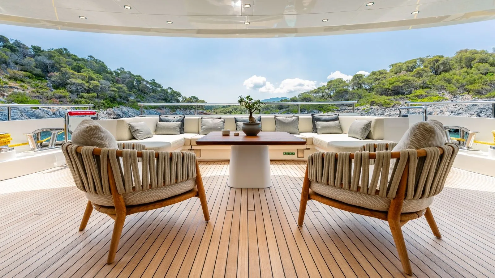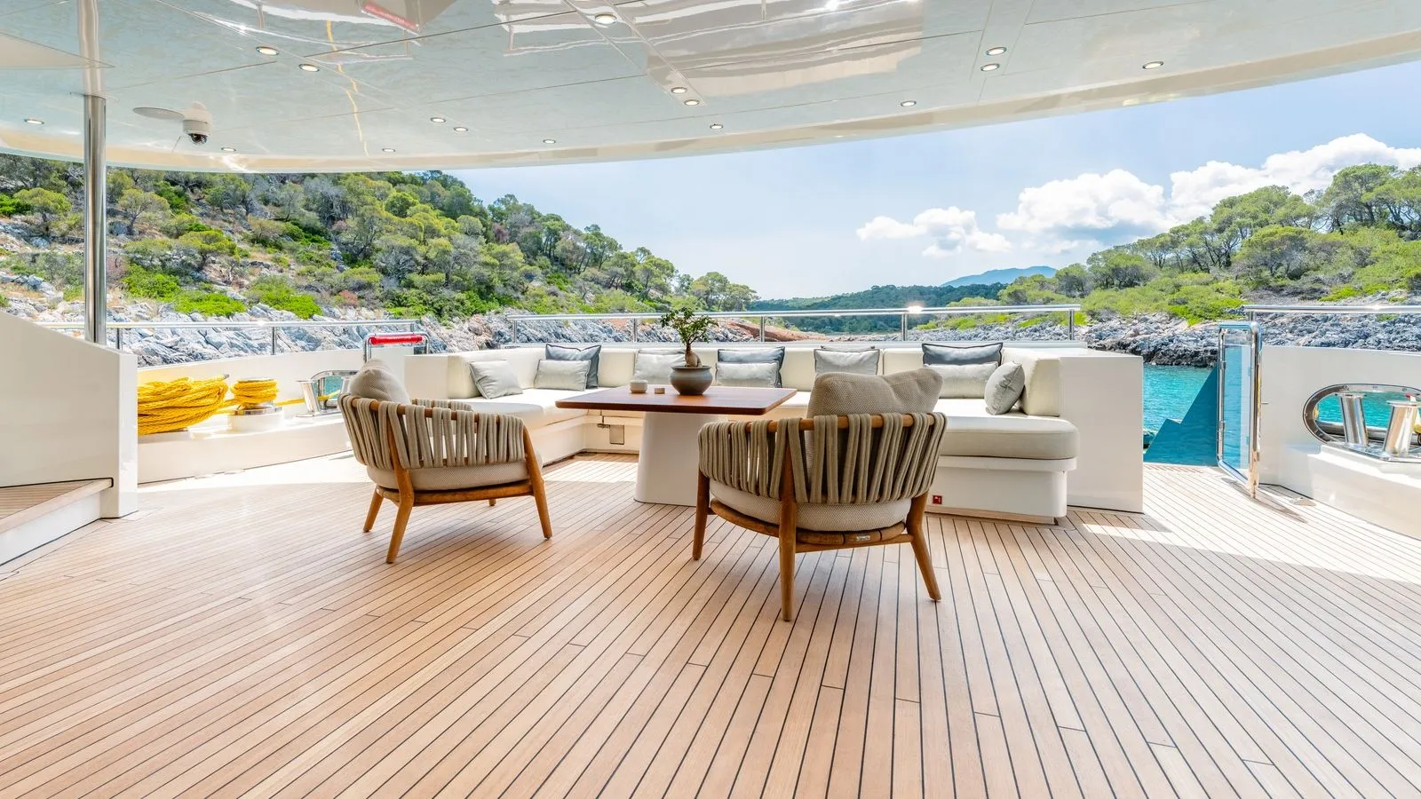 - Clean lines for a serene atmosphere\ Guests enjoy gourmet dining indoors or al fresco, prepared by the onboard chef.