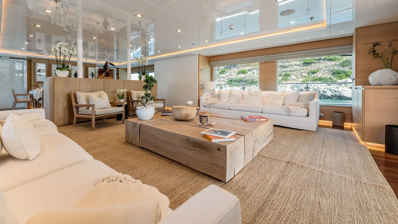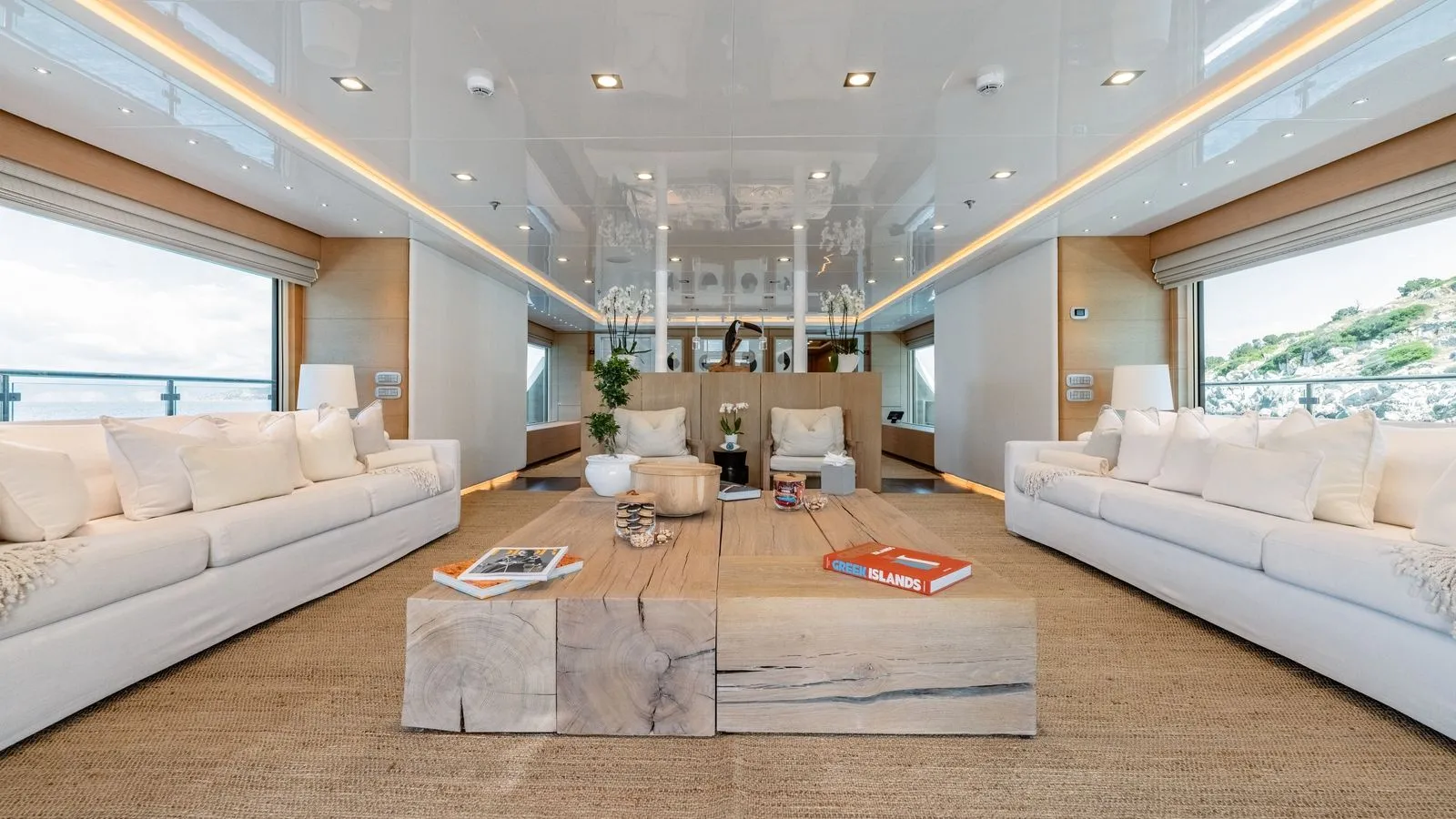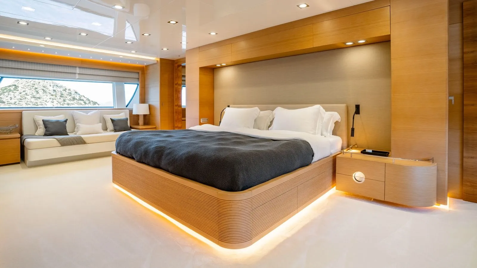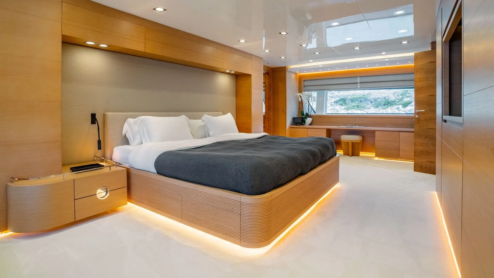 The yacht’s interiors feature minimalist elegance with: