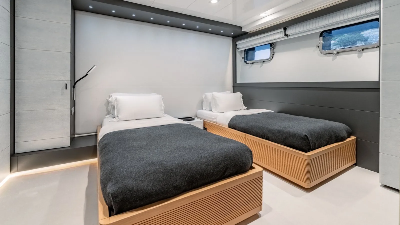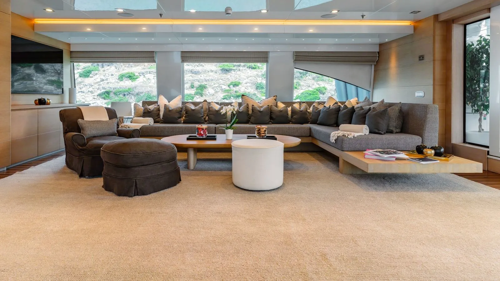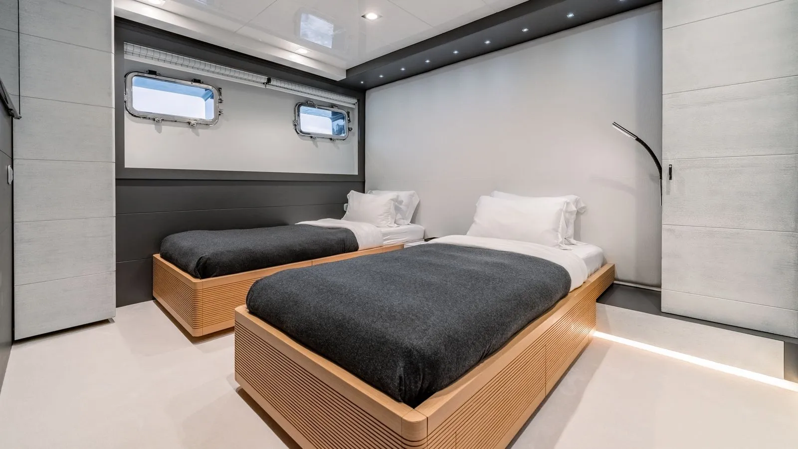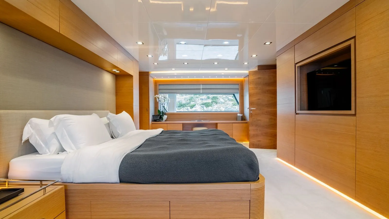 The yacht’s interiors feature minimalist elegance with: