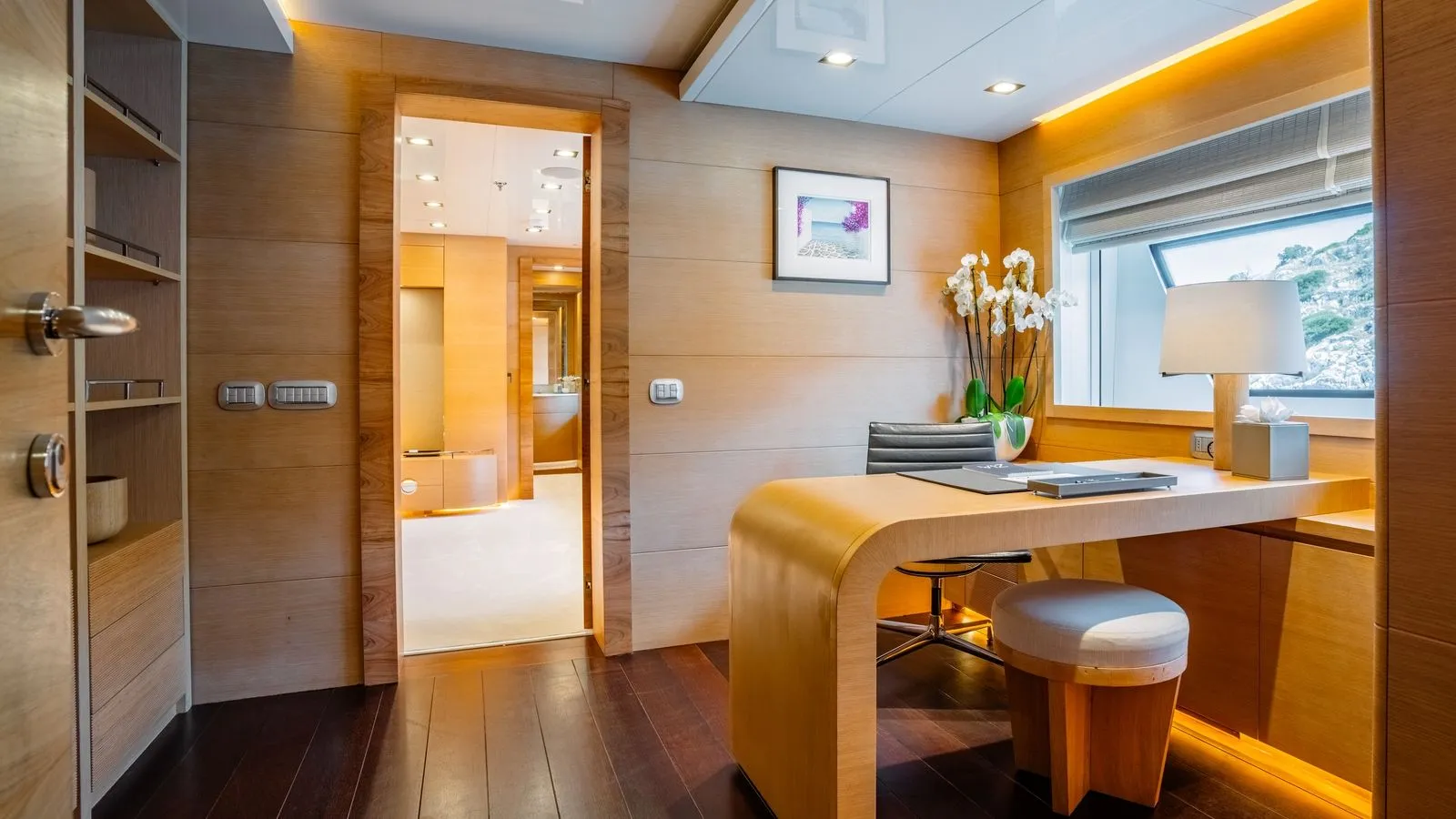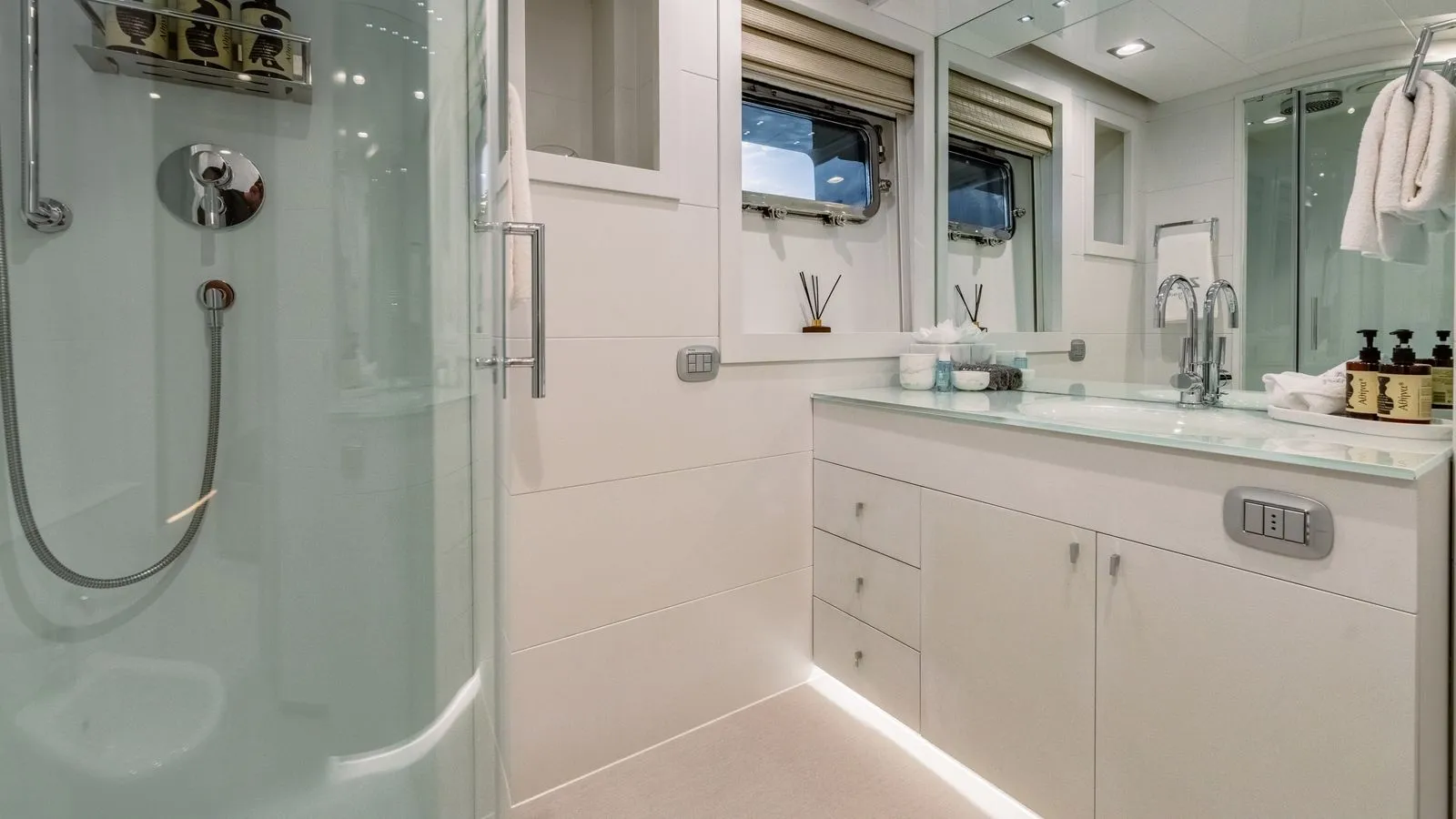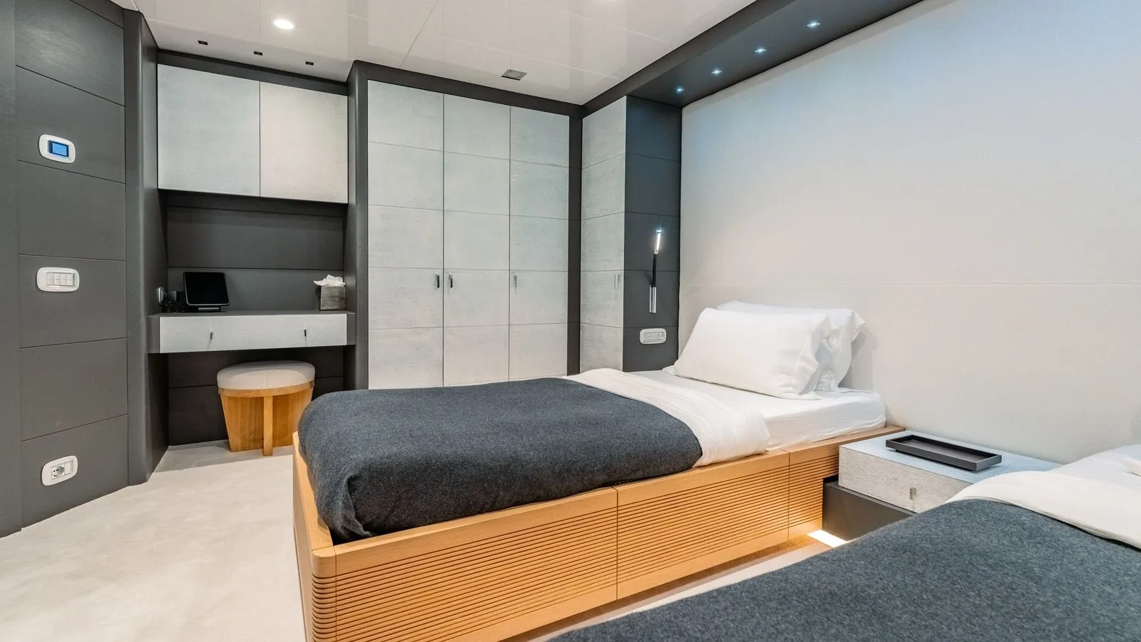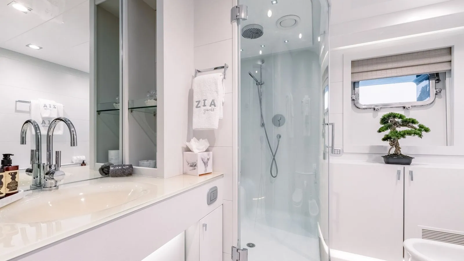 The yacht’s interiors feature minimalist elegance with: